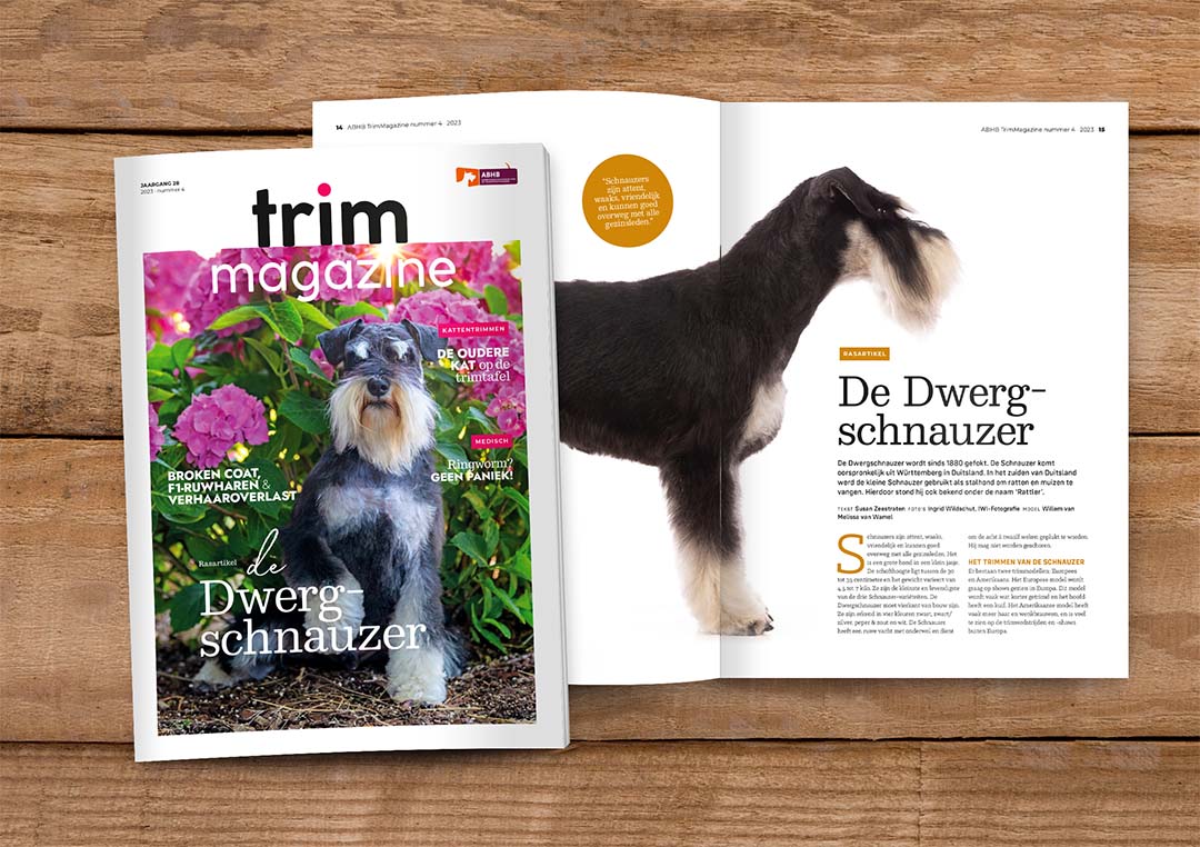 De vierde editie van het TrimMagazine is uit! In dit nummer staat de Dwergschnauzer centraal, lees je waar je op moet letten wanneer je een oudere kat op de trimtafel hebt en krijg je 3 groeitips voor social media. Natuurlijk ontbreekt ook de nieuwe rubriek ‘Stagebegeleider & stagiaire’ niet. Dit keer ontmoeten we Mariëlle Dijkhuizen van Trimsalon Chez Ches en stagiaire Natasja Terlingen.