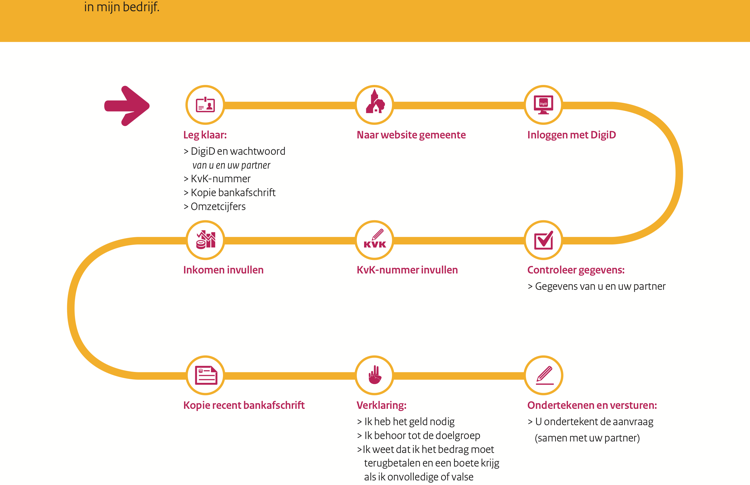 In deze infographic zie je hoe de aanvraag in zijn werk gaat welke gegevens je paraat moet hebben voor de aanvraag. Let op dat je bij elke aanvraag onderbouwt dat de coronacrisis de reden is dat je deze financiële ondersteuning nodig hebt.